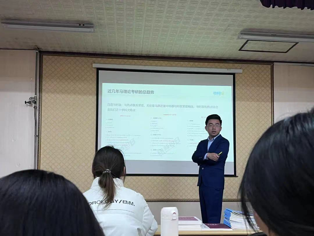 首先,常老师分析了当前马克思主义理论的考研形势,明确点出目前报考人数只增不减,跨考同学占比较大的现实问题,考研形势依旧严峻。随后,他以“我们为什么要考研”这个问题为切入点,向大家强调了明确考研动机的重要性,并针对考研题型、择校考虑、如何安排复习计划等方面为同学们进行了细致地讲解和指导。最后,常老师就同学们提出的问题进行了针对性答疑,并向同学们赠送了考研书籍和笔记本。本次考研指导讲座深入浅出,联系实际,为同学们指明了奋斗目标和努力方向,坚定了同学们的考研信心。