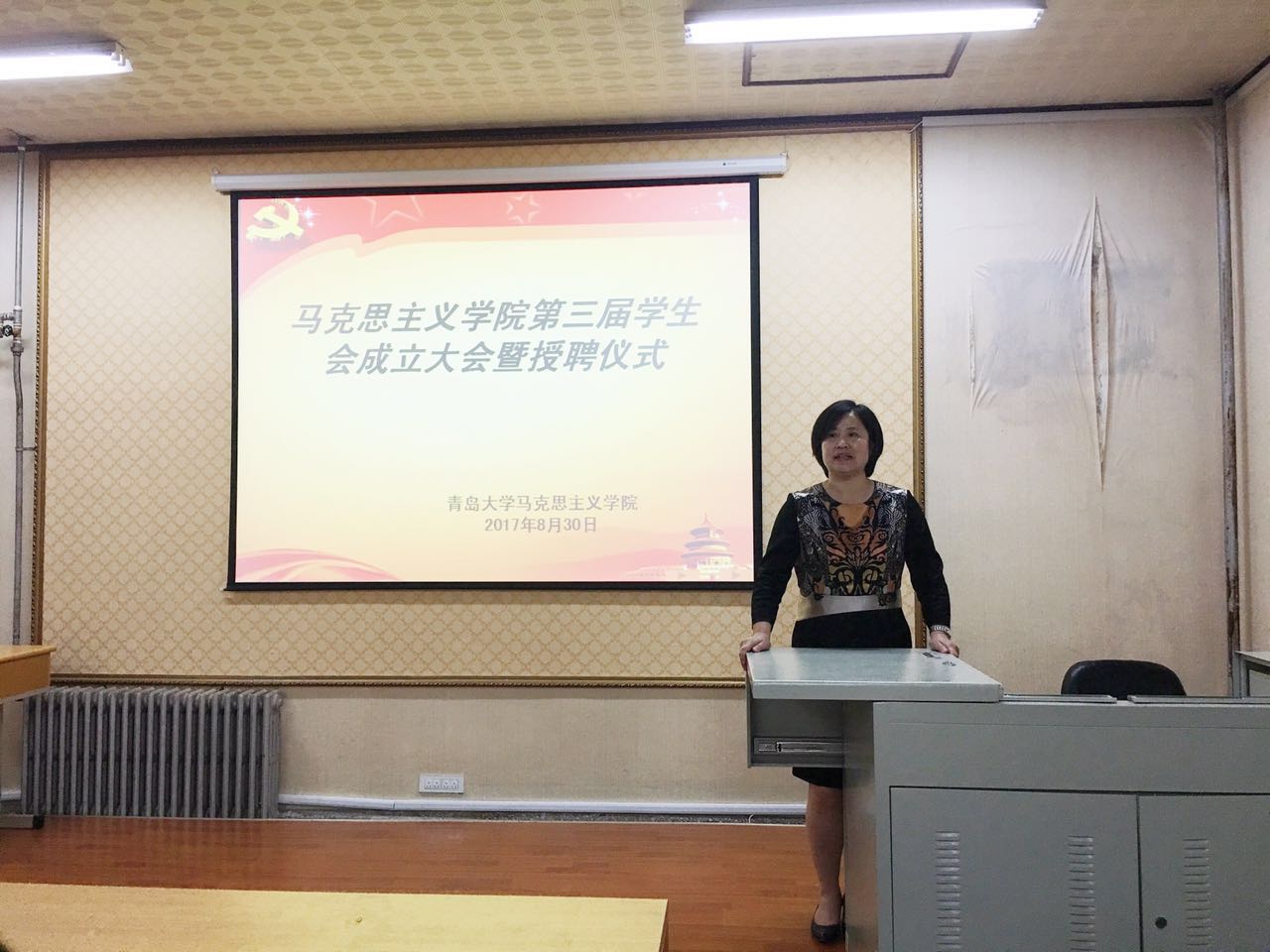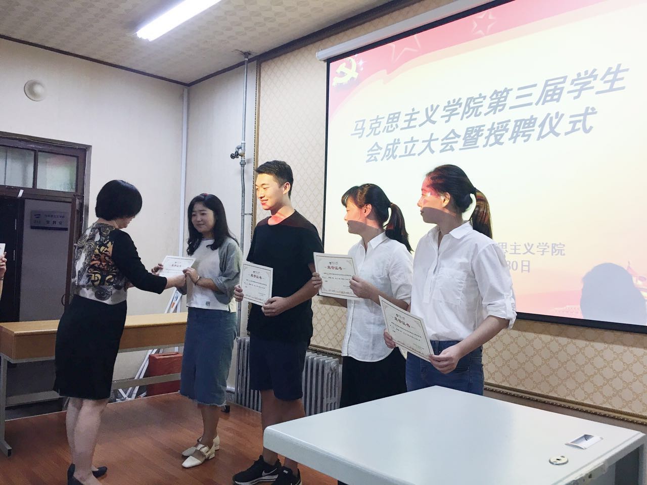 徐海春为学生会新一届主席团成员以及各部部长颁发聘书,徐海春表达了对新一届学生会干部的肯定和殷切期望,告诫我们,作为学生干部要有服务意识,不要有架子,要真真切切为老师和同学服务。
