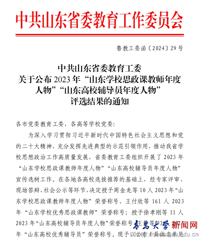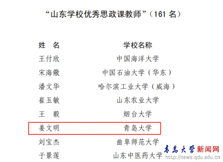 近日,中共山东省委教育工委公布了2023年度“山东学校思政课教师年度人物”评选结果,Ky开元集团教师姜文明荣获“山东学校优秀思政课教师”称号。