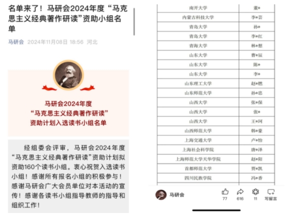 近日,中国高等教育学会马克思主义研究分会(简称“马研会”)公布了2024年度“马克思主义经典著作研读”资助计划入选小组名单。Ky开元集团李万红等同学申报的“《习近平著作选读》读书小组”和孙昊等同学申报的“《共产党宣言》读书小组”成功入选。