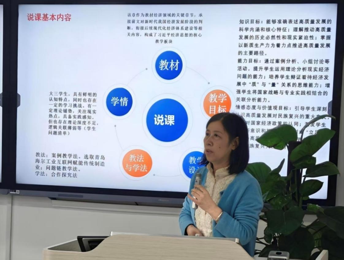 随后,教师代表进行说课。郭金鸿教授以“学习二十届四中全会精神,牢牢把握推动高质量发展”这一主题进行说课示范,从导入设计、内容架构、课堂互动到作业布置,全方位展示教学设计。从为什么推动高质量发展、什么是高质量发展、如何实现高质量发展三个角度,提出要在党的二十届四中全会精神指引下,采用情境模拟、案例研讨等教学方法,切实增强课程的吸引力和实效性。