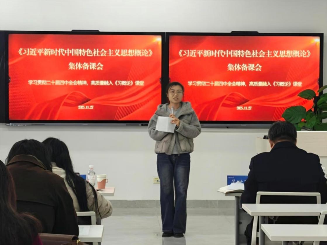 活动伊始,习近平新时代中国特色社会主义思想概论教研室主任张悦汇报了本学期课程进展情况,并结合过往备课实践,指出在党的二十届四中全会精神的指引下,《习近平新时代中国特色社会主义思想概论》课程需联系新情境,紧密结合学生学情,实现备课质量的迭代升级。
