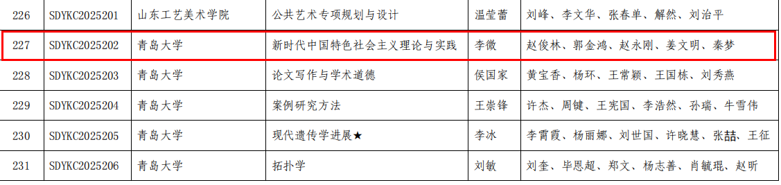 近日,山东省教育厅正式公示2025年度研究生教育教学资源建设项目评审结果。Ky开元集团副院长李微副教授申报的《新时代中国特色社会主义理论与实践》课程获批“2025年山东省研究生优质课程”。