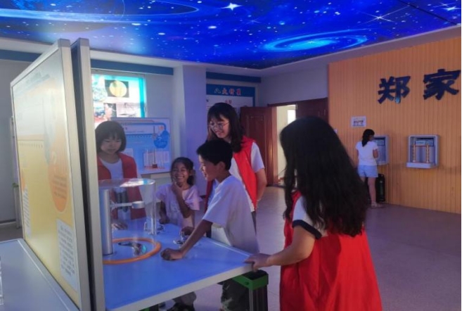 大扫除之后,宣讲团成员和孩子们来到郑家社区科普馆,馆内陈列有汽车模拟驾驶、动感地面、空中成像、光纤传声、声悬浮、骨传导、光线游戏等科技展品。通过参与、互动和体验生动形象、引发联想的展品,引导孩子们进入科学的世界,对普及科学知识、掌握科学方法、树立科学思想、反对邪教和封建迷信具有积极意义。宣讲团成员和孩子们共同操作和演示各类科学实验,探究实验背后的科学原理和科学知识,了解科学的奥秘,感受科学的魅力。