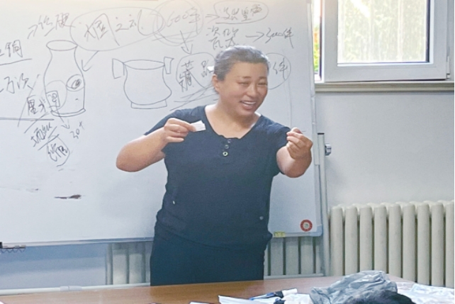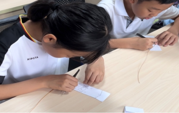 在制作过程中,笃行宣讲团成员协助尹老师耐心地指导小朋友们进行掐丝和点蓝等工序。掐丝时,需要先将金属丝捋直,再弯成合适的弧度,精确地掐在画面上;点蓝时,则需将颜料与清水混合均匀,再细心地填充到金属丝之间的间隙中。每一步都需匠心独运,方能成就一幅完美的掐丝珐琅作品。